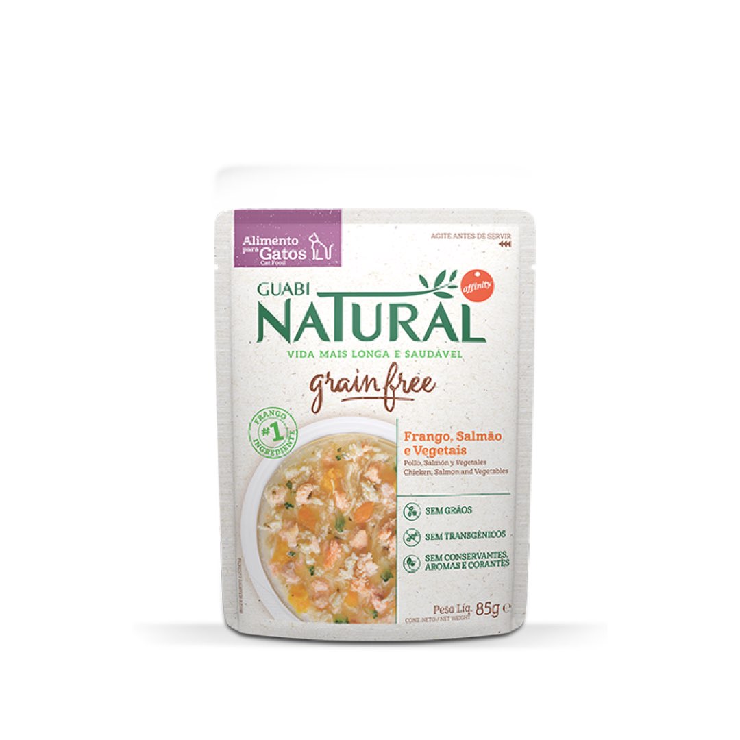 RAÇÃO ÚMIDA GUABI NATURAL SACHÊ GRAIN FREE GATO ADULTO CASTRADO FRANGO, SALMÃO E VEGETAIS 85G